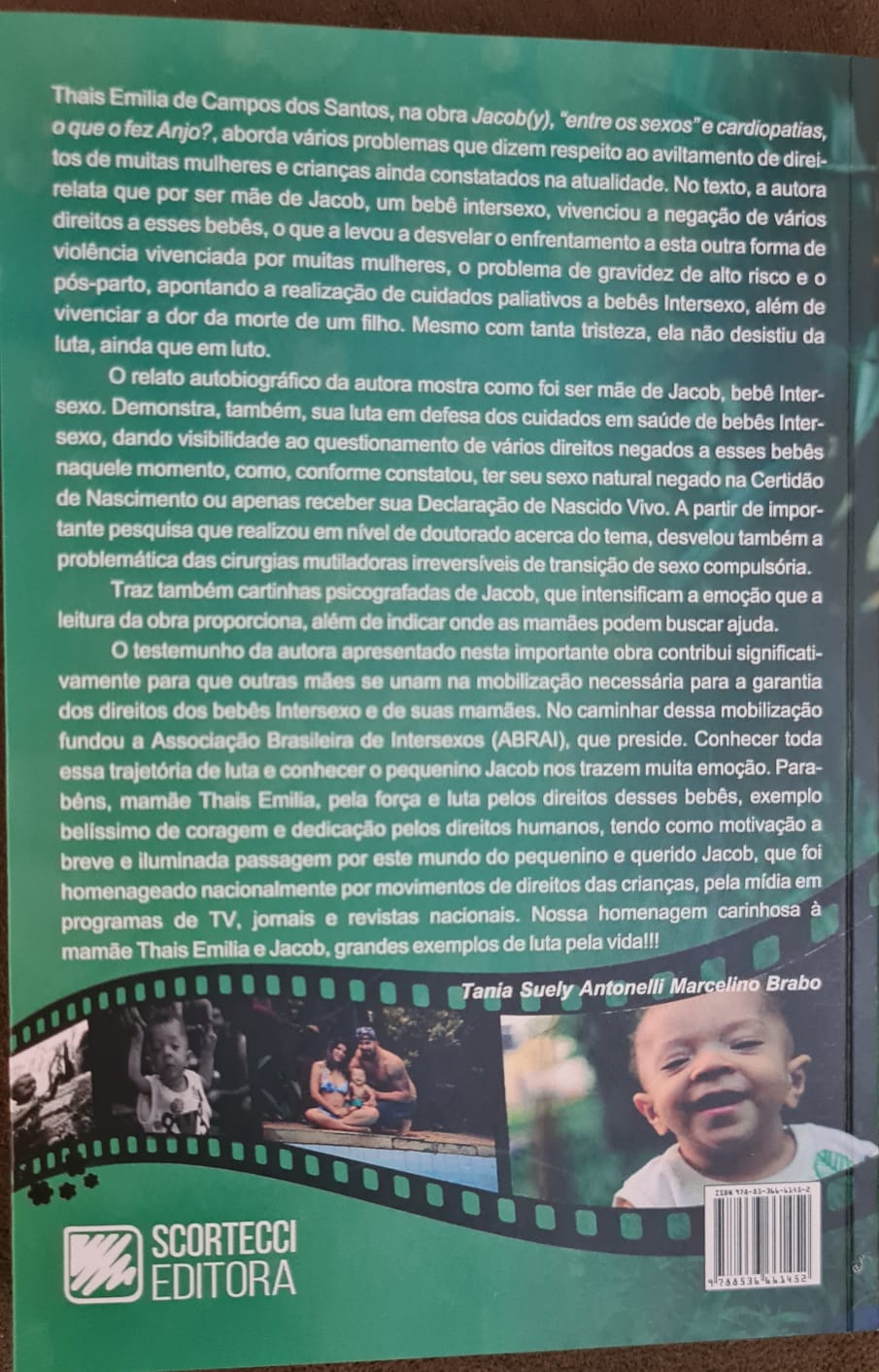 Thais Emilia de Campos dos Santos, na obra Jacob(y), “entre os sexos” e cardiopatias, o que o fez Anjo?, aborda vários problemas que dizem respeito ao aviltamento de direitos de muitas mulheres e crianças ainda constatados na atualidade. No texto, a autora relata que, por ser mãe de Jacob, um bebê intersexo, vivenciou a negação de vários direitos a esses bebês, o que a levou a desvelar o enfrentamento dessa outra forma de violência vivenciada por muitas mulheres, o problema da gravidez de alto risco e o pós-parto, apontando a realização de cuidados paliativos a bebês intersexos, além de sofrer a dor da morte de um filho. Mesmo com tanta tristeza, ela não desistiu da luta, ainda que em luto. O relato autobiográfico da autora mostra como foi ser mãe de Jacob, bebê intersexo. Demonstra, também, sua luta em defesa dos cuidados em saúde de bebês intersexos, dando visibilidade ao questionamento de vários direitos negados a esses bebês naquele momento, como, conforme constatou, ter seu sexo natural negado na Certidão de Nascimento ou apenas receber sua Declaração de Nascido Vivo. A partir de importante pesquisa que realizou ao nível de Doutorado acerca do tema, desvelou também a problemática das cirurgias mutiladoras irreversíveis de transição de sexo compulsória. Traz também cartinhas psicografadas de Jacob, que intensificam a emoção que a leitura da obra proporciona, além de indicar onde as mamães podem buscar ajuda. O testemunho da autora, apresentado nesta importante obra, contribui significativamente para que outras mães se unam numa mobilização necessária para a garantia dos direitos dos bebês intersexos e das mamães. No caminhar desta mobilização, fundou a Associação Brasileira de Intersexos (ABRAI), que preside. Conhecer toda essa trajetória de luta e conhecer o pequenino Jacob traz muita emoção. Parabéns, mamãe Thais Emilia, pela força e luta pelos direitos desses bebês, exemplo belíssimo de coragem e dedicação pelos direitos humanos, tendo como motivação a breve e iluminada passagem por este mundo do pequeno e querido Jacob, homenageado nacionalmente por movimentos de direitos das crianças, pela mídia em programas de TV, jornais e revistas nacionais. Nossa homenagem carinhosa à mamãe Thais Emilia e ao Jacob, grandes exemplos de luta pela vida!!!